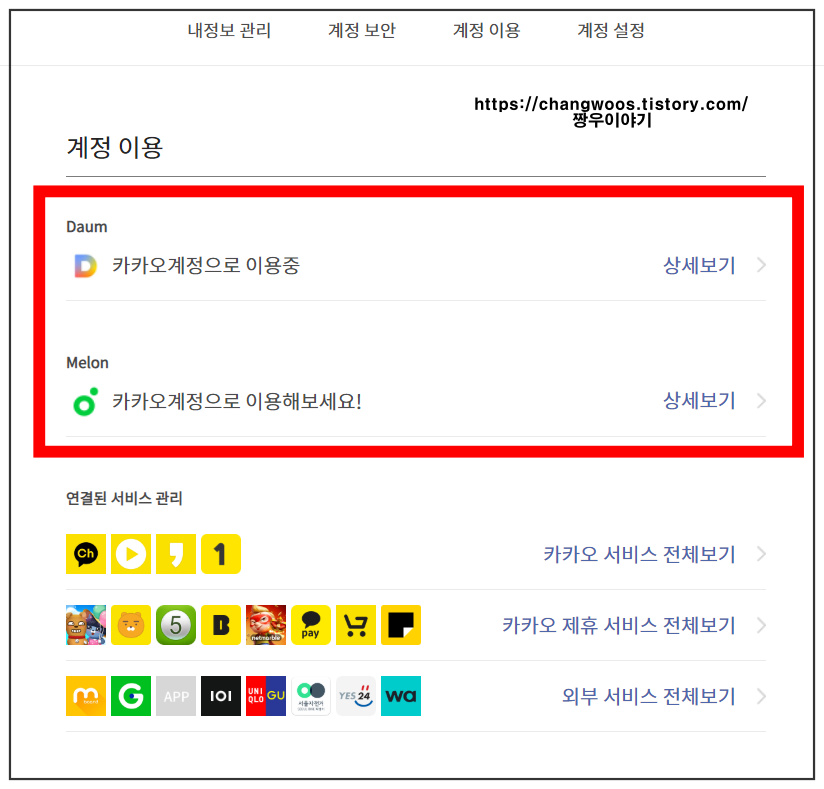 ▼계정 이용을 누르면 아래에 현재 이용하고 있는 카카오 관련 서비스들이 나옵니다. 저의 경우는 다음을 카카오계정으로 이용중이라 카카오계정 탈퇴 시 다음계정도 같이 탈퇴가 되겠네요. 더 많은 서비스를 이용하는 분들이면 나중에 문제가 생길수 있기 때문에 꼭 확인이 필요합니다.