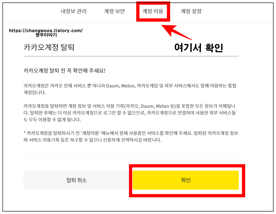 ▼카카오와 관련된 서비스를 이용하지 않는 분이라면 아래의 노란 확인 버튼을 터치해 주면 카카오 통합계정 탈퇴가 완료됩니다. 카카오 관련 서비스를 전에 이용했던 분들은 가장 위의 계정 이용을 눌러서 Melon, Daum 등 카카오 관련 외부서비스등을 확인할 수 있습니다.