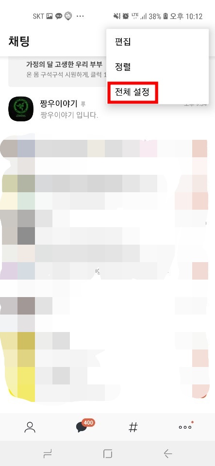 ▼그러면 편집, 정렬, 전체 설정 목록이 나옵니다. 가장 아래에 있는 전체 설정을 터치해 줍니다.