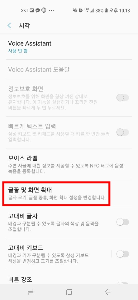 ▼시각 목록에서 조금 아래에 있는 글꼴 및 화면 확대를 터치해 줍니다.