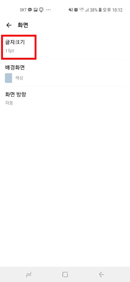 ▼그러면 화면에서 글자크기, 배경화면, 화면 방향을 설정하실 수 있는데요. 첫번째에 있는 글자크기를 터치해 줍니다. 현재 제 휴대폰의 글자크기는 15pt 네요.