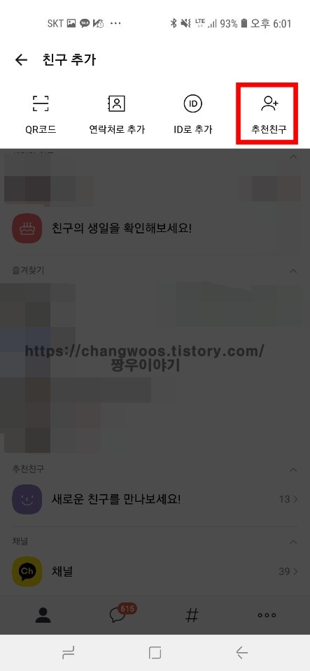 ▼그러면 친구 추가 목록으로 QR코드, 연락처로 추가, ID로 추가, 추천친구 가 나오게 되는데요 가장 오른쪽에 있는 추천친구 버튼을 터치해 줍니다.