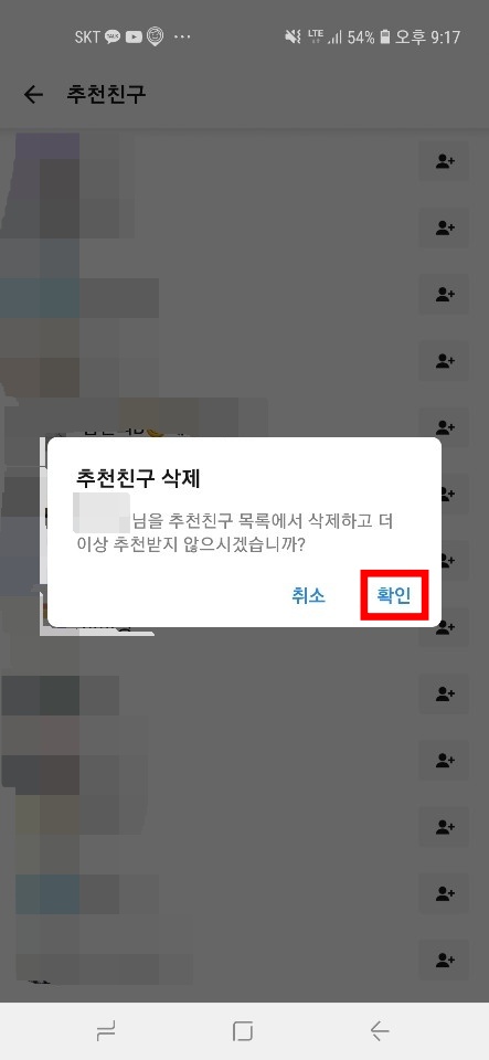 ▼삭제 버튼을 눌러도 바로 삭제 되지 않고 OOO님을 추천친구 목록에서 삭제하고 더이상 추천받지 않으시겠습니까? 란 확인 메시지가 한번 더 나옵니다. 현재 추천친구 삭제 시 복구가 불가능 하기 때문에 삭제시 꼭 주의하셔야 합니다. 아래의 확인 버튼을 터치하면 삭제가 완료 됩니다.