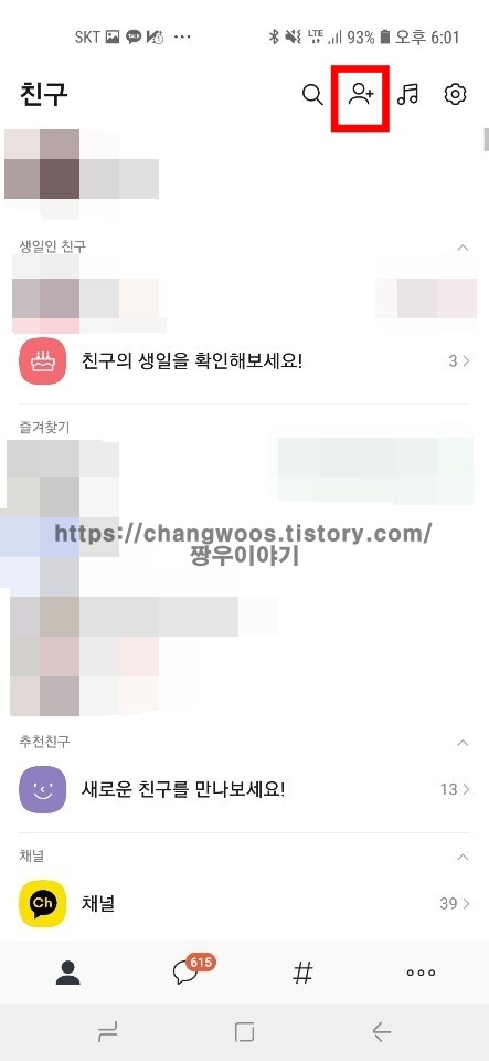 ▼그럼 친구목록이 나오게 되는데요. 여기서 가장 위 오른쪽의 사람+(친구추가) 버튼을 터치해 줍니다. 단순히 아래의 추천친구를 통해 들어가셔도 상관없습니다.