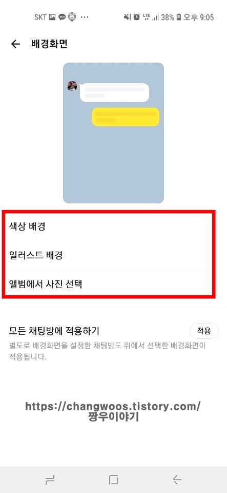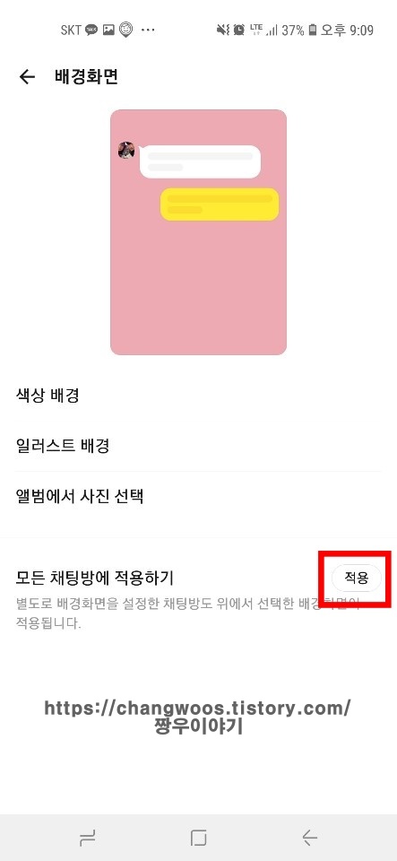 ▼그러면 위에 카톡의 배경화면을 미리보여주는 창이 나오는데요. 이 창에서 원하는 배경화면색으로 변경되었는지 확인하실 수 있습니다. 참고로 잘 사용하지는 않지만 배경화면을 방마다 별도로 설정하실 수도 있는데요. 이 때 지금 바꾼 배경화면이 적용되지 않습니다. 그럴 경우 아래의 적용 버튼을 터치해 주시면 방마다 별도로 설정한 배경화면 또한 바뀌게 되어 모든 채팅방에 적용됩니다.