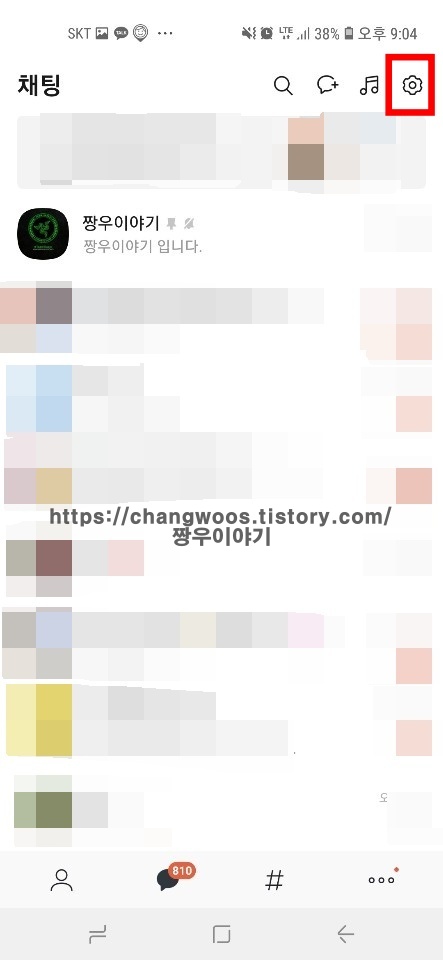 ▼카카오톡 앱을 실행 후 처음 나오는 화면에서 오른쪽 위의 톱니바퀴(옵션) 버튼을 터치해 줍니다.
