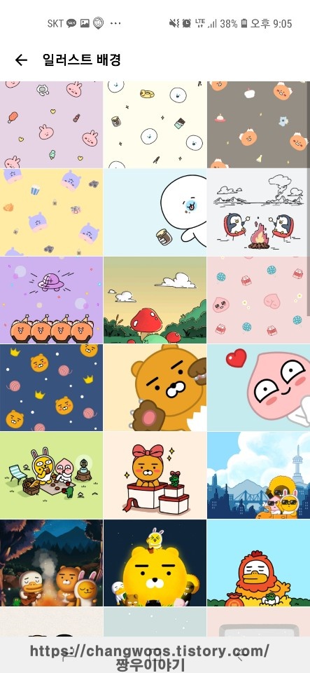 ▼배경화면에서 일러스트 배경을 터치해 주시면 카카오톡에서 지원하고 있는 일러스트 배경들이 나옵니다. 카카오톡 이모티콘에서 자주보이는 다양한 카카오프렌즈들이 그러져 있는 배경인데요. 카카오프렌즈 말고도 다른 일러스트 배경들도 있으니 구경해 보세요. 원하는 일러스트 배경이 있다면 터치해 무료로 배경화면을 바꿀 수 있습니다.