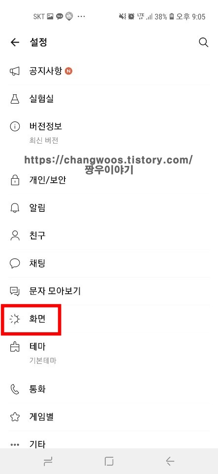▼전체 설정에서는 카카오톡에 관련된 모든 설정을 하실 수 있는데요. 전체 설정 중간정도에 보시면 화면 목록이 보입니다. 이 화면 목록을 터치해 줍니다.