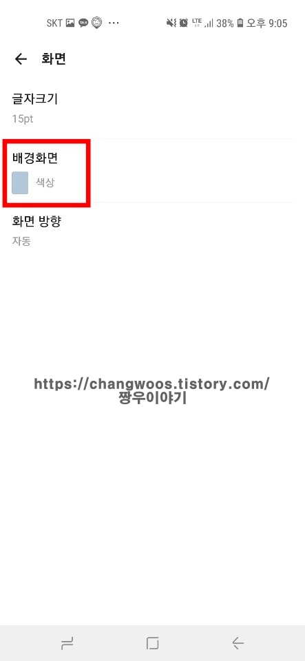 ▼그러면 글자크기, 배경화면, 화면 방향을 설정하실 수 있는데요. 가운데 있는 배경화면 목록을 터치해 줍니다. 배경화면 아래에 현재 적용되어 있는 옅은 파랑의 배경화면색이 보이네요.