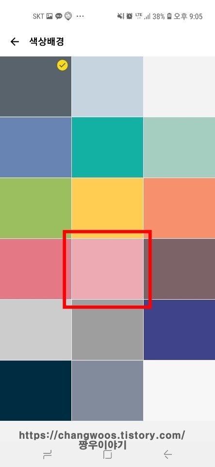 ▼배경화면에서 색상배경을 터치해 주시면 다양한 배경화면색으로 바꿀 수 있는데요. 현재 지원하고 있는 배경화면색은 총 17가지네요. 여기서 원하는 배경화면색을 터치해 줍니다. 전 핑크색으로 바꿔보겠습니다.