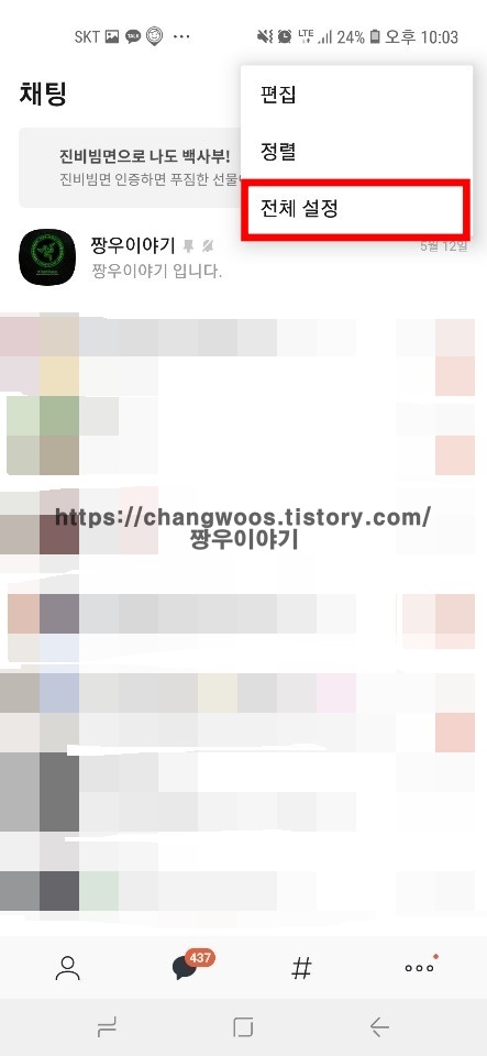 ▼그러면 편집, 정렬, 전체 설정 목록이 나오는데요. 세번째에 있는 전체 설정 목록을 터치해 줍니다.