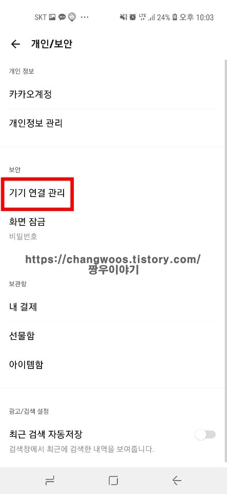 ▼그러면 보안 인증번호 확인, 다른 기기에서 로그인시 알림, 인증 기기 관리가 보이는데요. 카톡 PC 인증 해제를 위해 세번째에 있는 인증 기기 관리 목록을 터치해 줍니다.