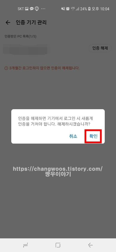 ▼그러면 '현재 PC 인증을 해제하시겠습니까?(인증을 해제하면 로그아웃됩니다.)' 라는 메시지가 나오는데요. 아래의 확인 버튼을 터치해 줍니다. 이때 인증 해제와 함께 모든 데이터가 삭제되기 때문에(체크 박스 그대로 유지할 경우) 개인정보를 보호할 수 있습니다.