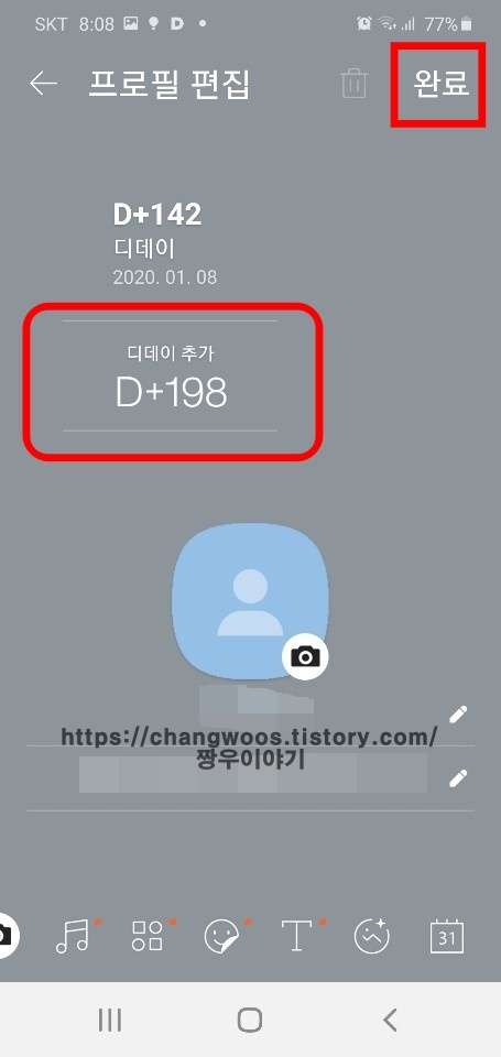 ▼그러면 아래 처럼 제가 만든 디데이가 추가된걸 확인하실 수 있습니다. 이로써 두개의 디데이가 만들어 졌는데요. 참고로 현재 카톡 프로필 편집에서 디데이는 최대 3개 까지 만들 수 있습니다. 디데이 추가 후 오른쪽 위의 완료 버튼을 터치해 줍니다.