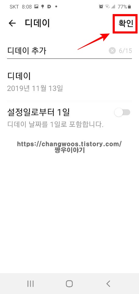 ▼이름(제목)과 날짜를 전부 설정하셨으면 오른쪽 위에 있는 확인 버튼을 터치해 줍니다.