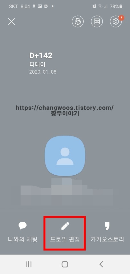 ▼예전에 설정해 놓은 디데이가 보이고 맨 아래에 나와의 채팅, 프로필 편집, 카카오스토리 목록이 보이는데요. 두번째에 있는 프로필 편집 목록을 터치해 줍니다.