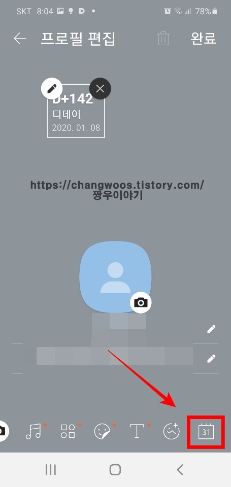 ▼맨 아래를 보시면 카카오뮤직, 스티커 등을 이용해 프로필 편집을 하실 수 있는데요. 오른쪽 끝으로 넘겨보시면 달력모양버튼이 보입니다. 이 달력(디데이 설정)버튼을 터치해 줍니다.