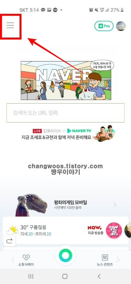 ▼먼저 휴대폰에 설치된 네이버 앱을 터치해 실행시킨 후 바로 보이는 네이버 홈 화면에서 왼쪽 위의 줄 3개(메뉴) 버튼을 터치해 줍니다. 참고로 저는 새로운(최신) 네이버 버전을 기준으로 설명드리지만 기본(기존) 네이버 버전을 사용하시는 분들도 동일한 방법으로 진행하시면 됩니다.