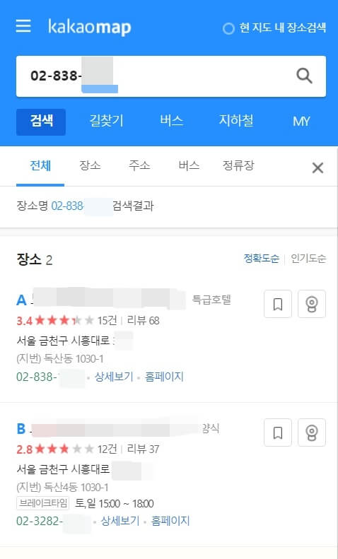 카카오맵에 들어가신 후 왼쪽의 검색창에 전화번호를 입력해 줍니다. 저는 임의의 전화번호로 검색해 보겠습니다. 번호를 입력하면 아래에 장소와 주소가 나옵니다. 이렇게 간단하게 전화번호로 주소를 찾으실 수 있습니다.