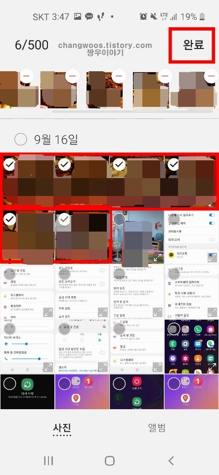저는 가장 많이 사용되는 파일인 이미지(사진)를 눌러보겠습니다. 그러면 내 스마트폰 갤러리가 열리고 여기서 보안폴더로 옮기고 싶은 사진을 터치해 선택해 줍니다. 저는 임의의 사진들을 선택해 보겠습니다. 모두 선택하셨으면 오른쪽 위에 있는 완료 버튼을 눌러 주시기 바랍니다.