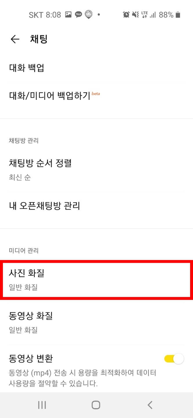 채팅 목록에서는 대화백업, 채팅방관리, 미디어 관리 등을 하실 수 있는데요. 미디어 관리 카테고리의 첫번째 메뉴에서 사진 화질에 들어가 줍니다. 바로 아래에 일반화질로 설정되어 있는것이 보이시나요? 여기서 카카오톡의 사진 화질을 설정하실 수 있습니다.
