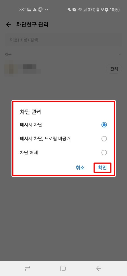 먼저 차단관리의 맨위의 메시지 차단은 메시지만 차단하는 기능이고요 프로필을 차단하지 못합니다.