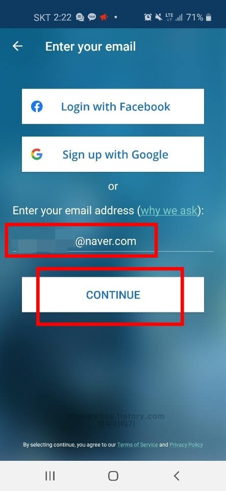 대부분 이메일 계정은 가지고 계시기 때문에 메일 인증을 통해 진행하도록 하겠습니다.. 아래 email adress 입력칸에 내가 사용하고 있는 이메일 주소를 입력하신 후 하단의 CONTINUE 버튼을 눌러 줍니다.