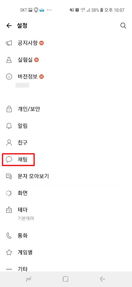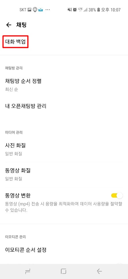 전체설정을 눌러주시면 여러가지 설정할수 있는 옵션이 나오는데 여기서 중간쯤에 있는 채팅을 눌러주고 누르면 오른쪽 사진 같이 나오는데 가장 상단에 있는 대화 백업을 들어가주시면 됩니다.