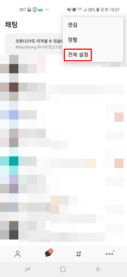 먼저 카카오톡 앱을 실행해주시면 왼쪽의 사진처럼 뜨는데 우측 상단의 톱니바퀴 아이콘(옵션)을 눌러줍니다. 눌르면 편집, 정렬, 전체설정 세가지 옵션이 나오는데 복구/백업을 위해서 전체설정을 눌러줍니다.
