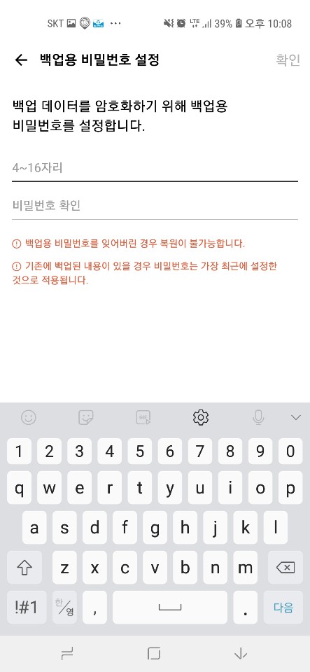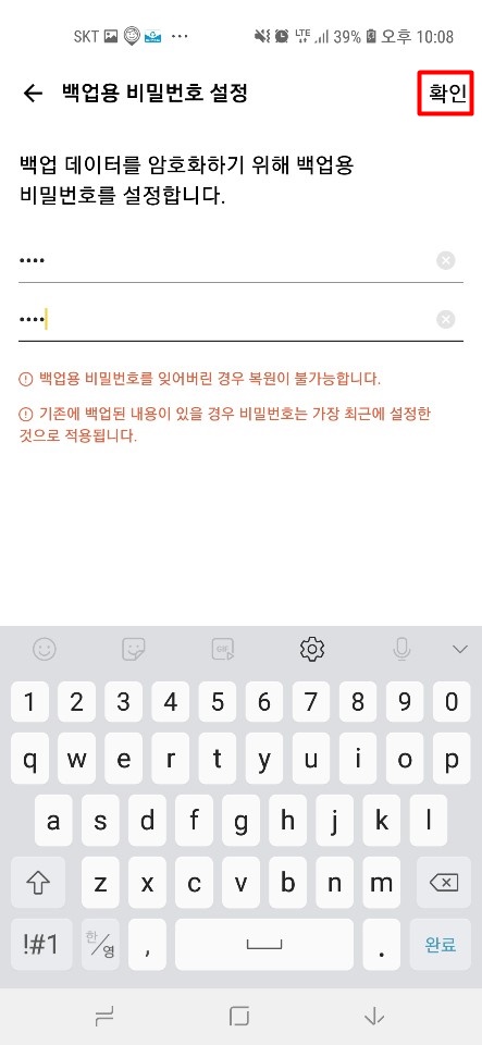■ 백업시 설정한 비밀번호를 누릅니다(찾기가 불가능하니 반드시 기억)