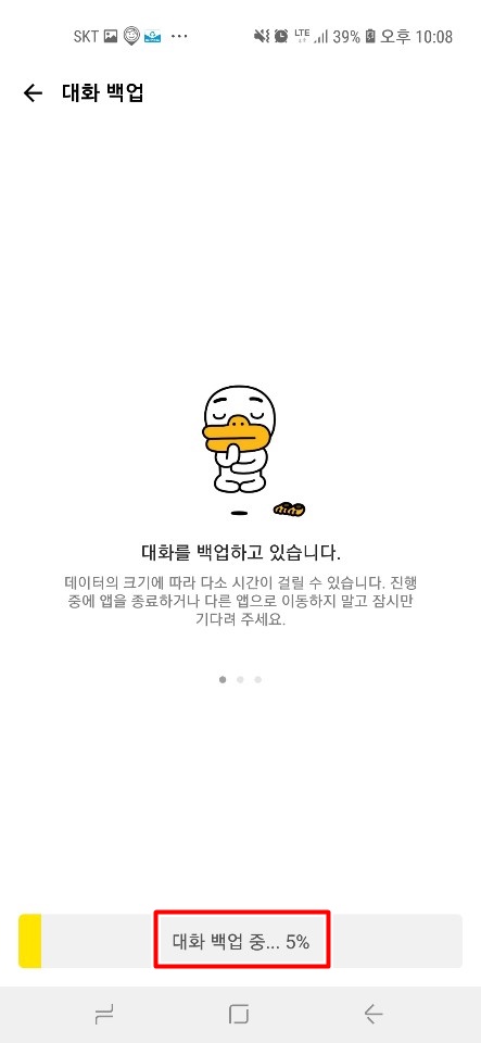 백업 비밀번호를 눌러주시면 왼쪽 사진처럼 오리 명사하는 이모티콘과 함께 제일 하단에 대화백업중... 이라는 문구가 나타나고 퍼센트 게이지가 점점 올라갑니다. 대화한 카톡량이 많을시에 더 많이 걸린다고 하는데 전 대략 3분 정도 걸린거 같습니다. 카톡기록이 많으신 분들도 거의 5분안에 전부 대화 백업이 되는거 같습니다. 백업이 완료되면 오른쪽 사진 대화 백업이 완료되었다고 나옵니다. 실수로 밑의 백업 데이터 삭제를 누르면 지금 한 백업 데이터가 전부 삭제됩니다.