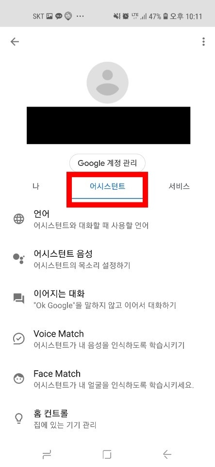 ▼그러면 위에 나, 어시스턴트, 서비스 메뉴가 나오는데 가운데인 어시스턴트 메뉴를 선택해 줍니다.