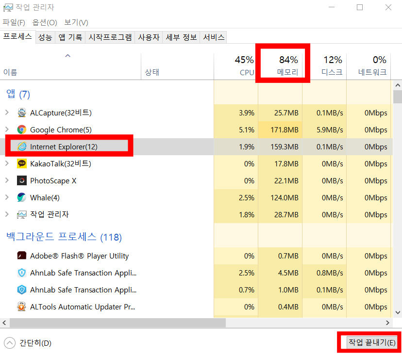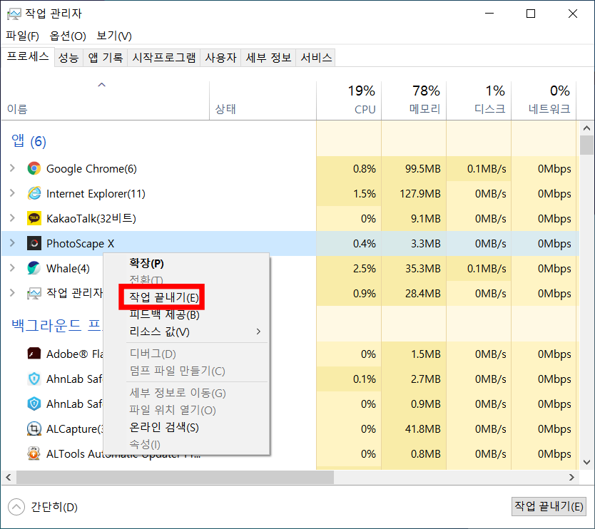 ▼다른 방법으로 프로세스-앱에서 삭제할 프로그램에 마우스를 가져다 대고 마우스 우클릭을 해서 작업끝내기(E)를 선택하셔도 됩니다.