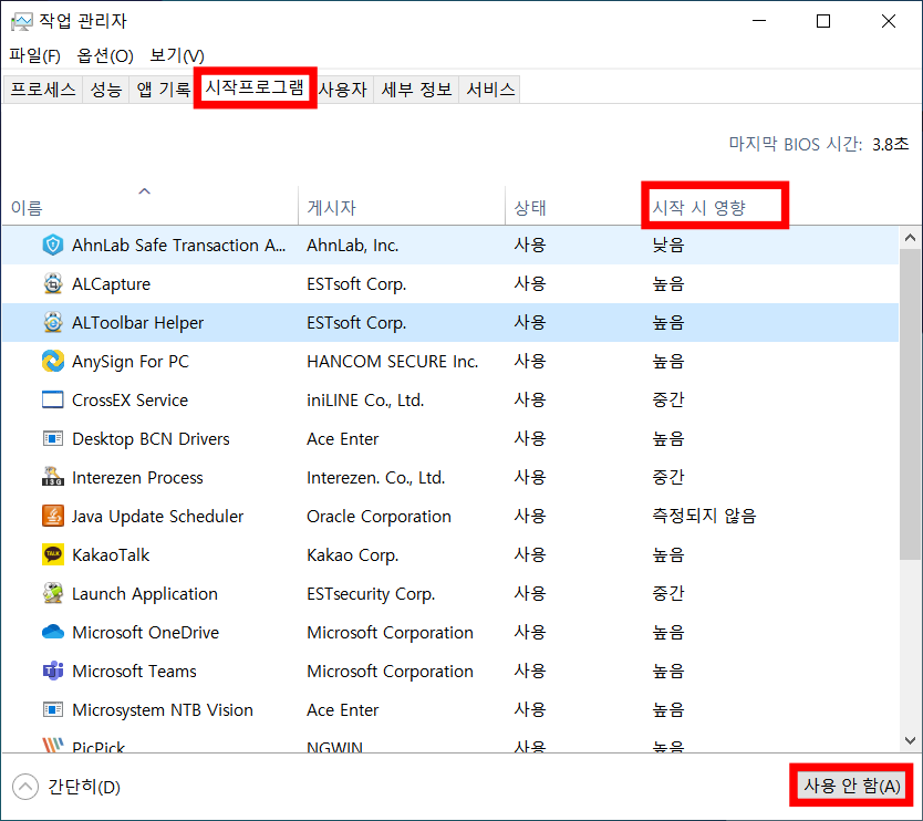 ▼추가적으로 작업관리자-시작프로그램 에 들어가서 컴퓨터의 속도를 더 빠르게 할수 있습니다. 아래의 프로그램들은 컴퓨터를 키고 윈도우10이 시작될대 자동으로 나오는 시작프로그램들 입니다. 당연히 시작프로그램들이 많을 수록 컴퓨터는 느려지기 때문에 불필요한 프로그램일 경우 시작시 영향이 크다면 선택후 오른쪽 아래에 사용 안 함(A)를 눌러주시면 됩니다.