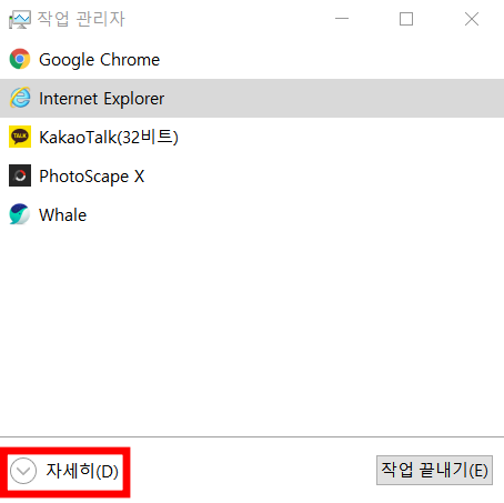 ▼작업관리자를 실행하시면 알고있는 작업관리자가 나오지 않아 당황하실수도 있는데 이 창은 작업관리자의 간단한 버전입니다. 그래서 현재 실행중인 프로그램만 나오게 됩니다. 아래에서 오른쪽에 자세히(D)를 눌러서 작업관리자의 상세버전으로 들어갑니다.