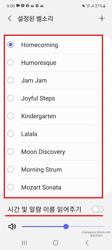 그리고 원하시는 [기본 알람음] 항목에 체크해 주세요. 정말 다양한 항목들이 있으니 하나씩 눌러보시고, 가장 마음에 드는 것으로 선택해 보세요. 참고로 하단에서 [시간 및 알람 이름 읽어주기] 기능을 설정할 수 있으니 빅스비 알람처럼 사용하고 싶은 분들은 참고하시면 좋을 거 같습니다.