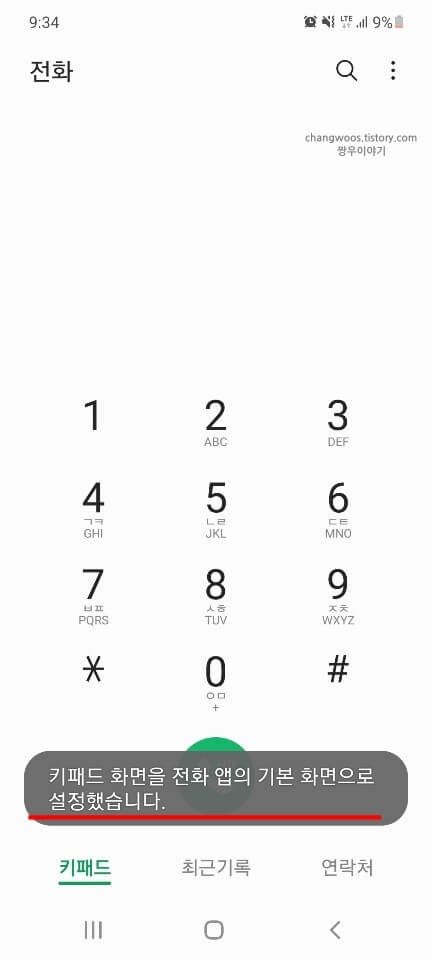4. 다음으로 하단을 보시면 키패드 화면이 전화 앱의 기본 화면으로 설정되었다는 알림 메시지를 보실 수 있습니다.