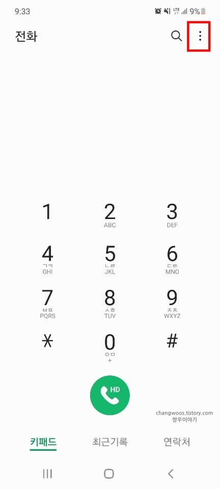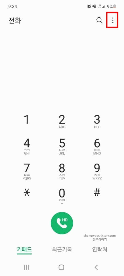 1. 일단 전화 앱에 들어오신 후 우측 상단의 [점 3개] 버튼을 눌러 줍니다.